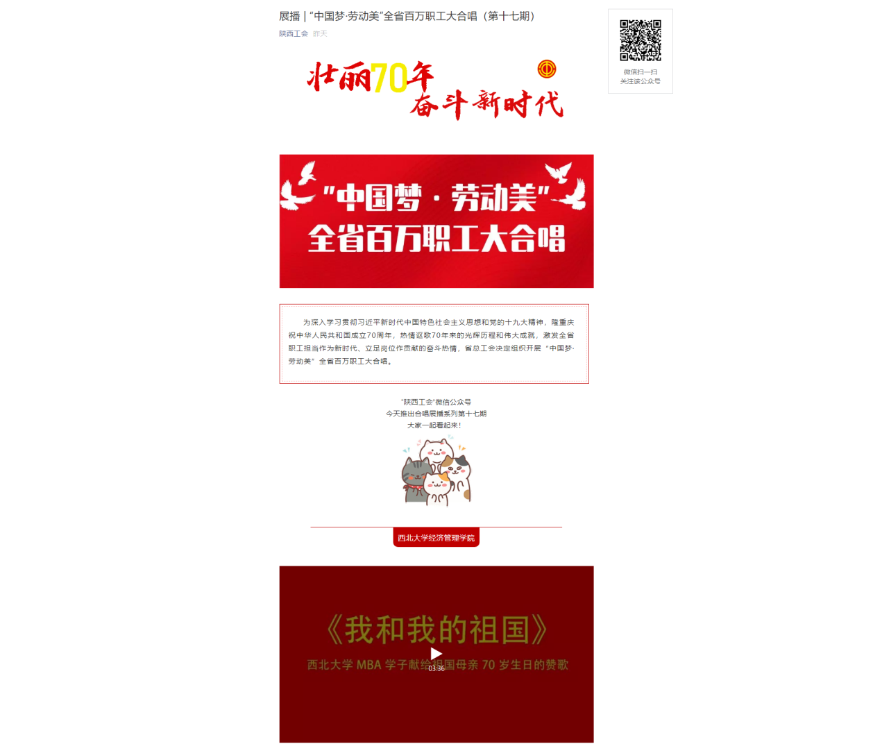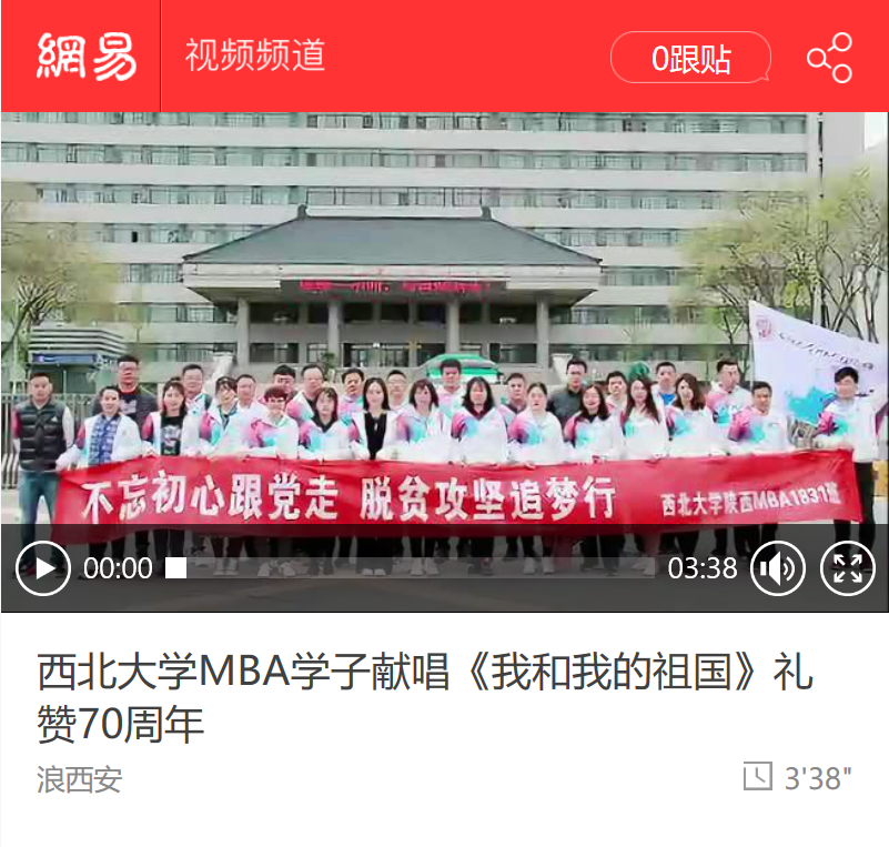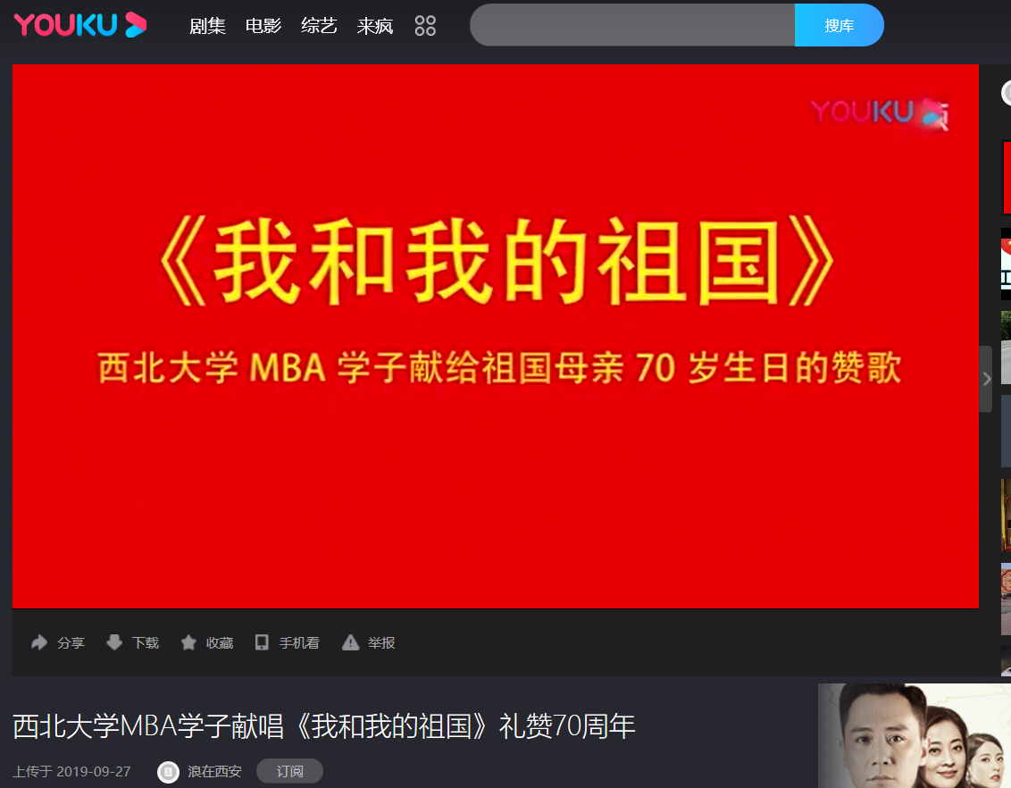 金秋气爽,丹桂飘香。2019年9月21日我院MBA学员唱响《我和我的祖国》,致敬我们伟大的祖国,献礼祖国70华诞。视频在陕西省总工会举办的“中国梦﹒劳动美”百万职工大合唱活动中展播,并在优酷、网易、今日头条等多家媒体网站收录。