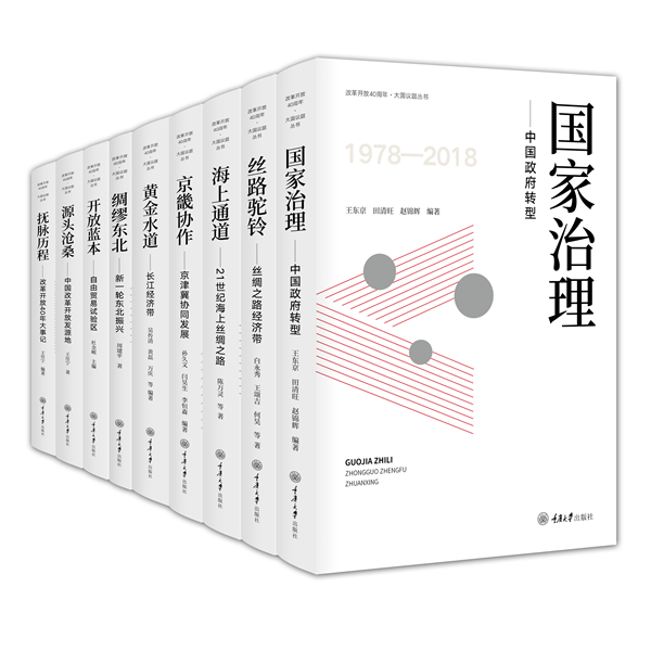“改革开放40周年·大国议题丛书”以习近平新时代中国特色社会主义思想为指导,选题聚焦党的十八大以来以习近平同志为核心的党中央治国理政的伟大实践,由中央党校(国家行政学院)副校(院)长王东京教授、重庆大学校长张宗益教授担任丛书编委会主任,作者来自中央党校、国家发展改革委、中国人民大学、西北大学等单位。该丛书先后入选重庆市出版专项资金资助项目(2017年)、教育部全国高校出版社主题出版项目(2018年)、国家出版基金资助项目(2019),于2018年底正式出版发行。丛书分为9卷,共300万字,各卷分别为《国家治理——中国政府转型》《丝路驼铃——丝绸之路经济带》《海上通道——21世纪海上丝绸之路》《京畿协作——京津冀协同发展》《黄金水道——长江经济带》《绸缪东北——新一轮东北振兴》《开放蓝本——自由贸易试验区》《源头沧桑——中国改革开放发源地》和《抚脉历程——改革开放40年大事记》。其中,《丝路驼铃——丝绸之路经济带》由白永秀教授领衔撰写,该书分八章研究丝绸之路经济带建设中的理论与实践问题,兼具理论系统性和可读性。