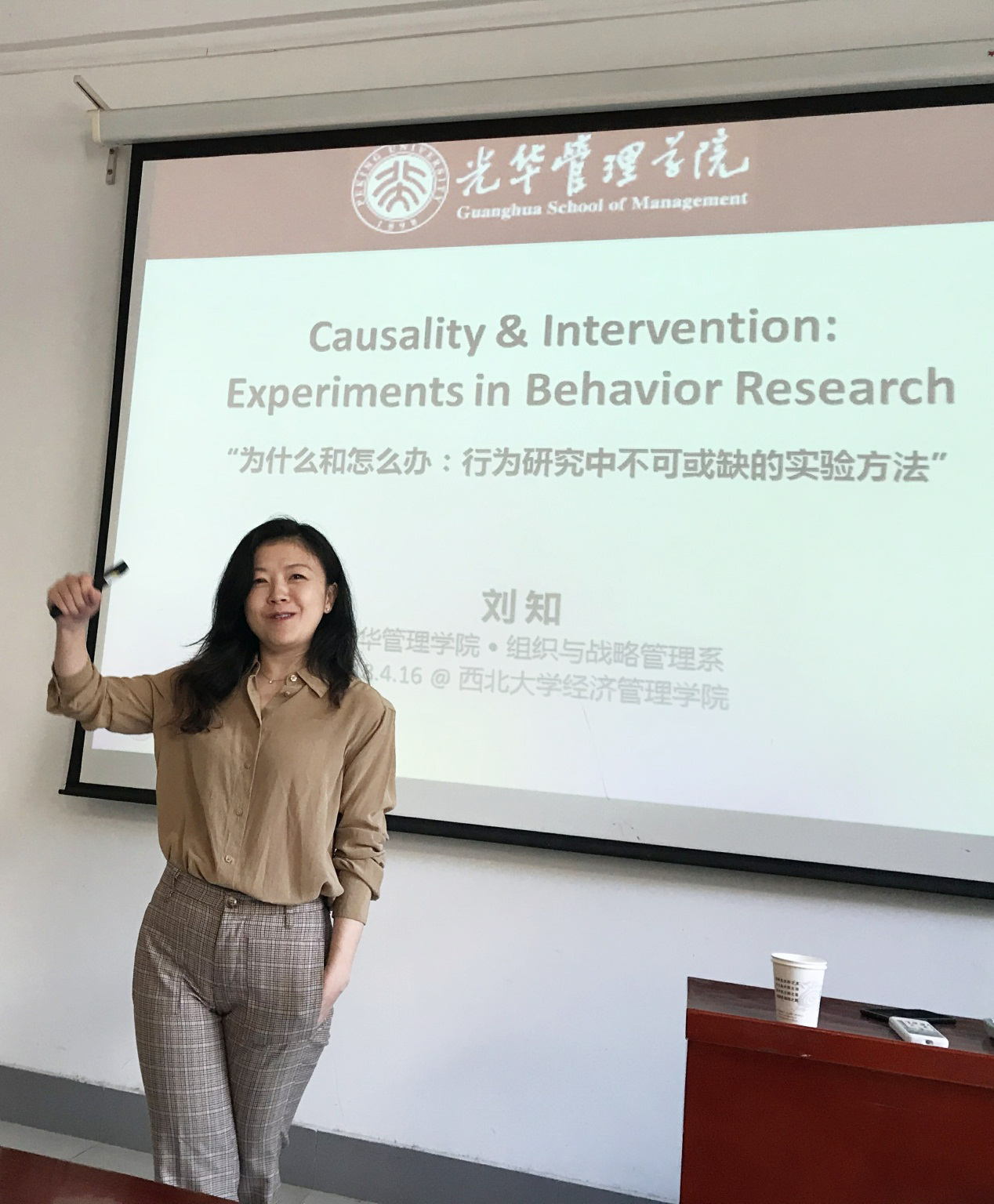刘知老师在776net必赢官网取得学士学位,在美国哥伦比亚大学商学院取得了管理学博士学位。她的主要研究领域为组织道德与公平、腐败的心理机制、跨文化组织与领导行为等,主持国家自然科学基金青年项目“直接上下级收入差距和层级间向上流动性对下属公平感知、工作态度及行为的影响研究”,参与国家自然科学基金重点项目“转型升级背景下组织创新的多层因素及动态机制研究”。她在本次沙龙中以“为什么和怎么办:行为研究中不可或缺的实验方法”为题目,生动形象、深入浅出地为大家介绍了心理实验法的各个环节和要素,并结合不同的研究实例进行了详细讲解,对大家理解实验法的科学逻辑、树立“实验思维”有很大帮助。最后,刘知老师还与现场老师和学生互动,专业、耐心地回答了他们所提出的问题。