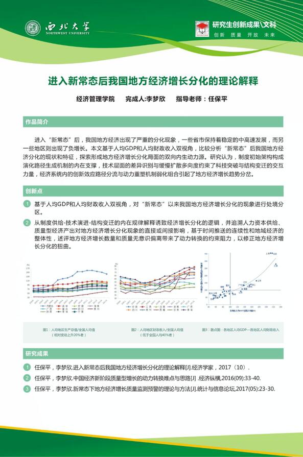 由陕西省委高教工委、省教育厅联合举办的陕西省第三届研究生创新成果展于2017年10月11日-12日在西安市曲江国际会展中心成功举办,经对参展作品现场展示,专家评审以及厅务会议审议等程序进行参评,我院任保平教授及其指导的硕士研究生李梦欣共同完成的文章《进入新常态后我国地方经济增长分化的理论解释》获得了陕西省第三届创新成果展文科组一等奖。