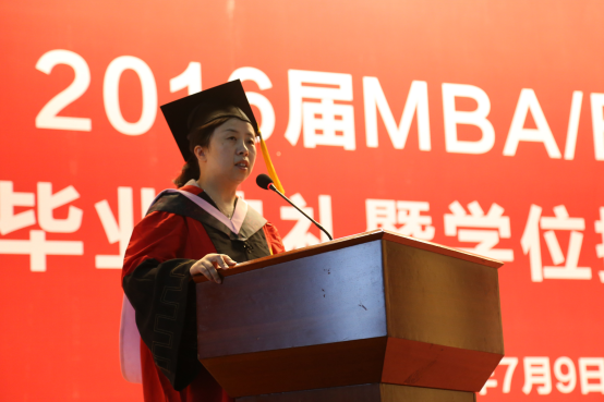 学院副院长何爱平教授发表讲话。她希望西大MBA学子勇于担当时代大任,在工作岗位上开拓进取,恪守诚信,成就事业,推动文明进步,以优异卓越的商业表现来彰显西北大学MBA的价值,努力做人文MBA的践行者,做新商业风范倡导者,做未来社会的引领者。教师代表李辉副教授与毕业生们分享了他的临别寄语,一是要学会管理好自己的时间、健康与情绪,二是既要讲规则也要讲原则,三是做正能量的传播者,带着西大的精神与思想,走得更高、更远。2013级孔繁荣同学代表所有毕业生发表了毕业感言,回顾了在校期间的美好记忆,也为毕业生、学院和母校送上了美好祝福。