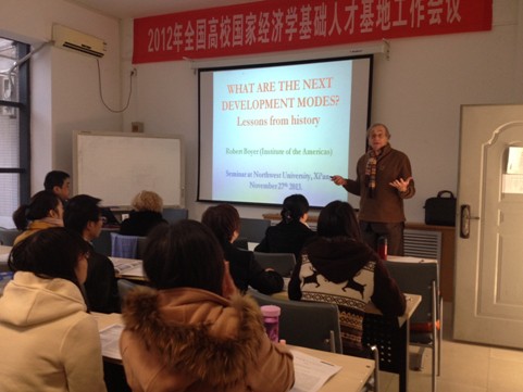 2013年11月27日上午,经管学院邀请国际高端专家短期教学系列讲座在长安校区8202教室举行。法国经济学调节学派代表人物Robert Boyer教授做了题为“增长是否带来繁荣?”(Does growth bring prosperity?)和“未来的发展模式是什么?”(What could be the next development models?)的学术报告。我院经济学博士、硕士及部分教师聆听了报告。报告会由经济学系系主任何爱萍教授主持。
