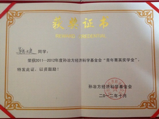 我院2010级西方经济学博士生魏婕于2012年2月通过申报材料初审,被选为该奖候选人。后于2012年3月至9月在中国社会科学院城市与竞争力研究中心实习。在实习期间参与《中国城市竞争力报告No.10》主报告的编写工作并任该书的主编助理,另参与了相关课题、学术研究以及会议等工作。由于实习期表现优异,受到一致好评,于2012年10月魏婕博士被授予2011-2012年度孙冶方经济学基金会“青年菁英奖学金”。