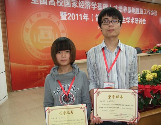 2011年11月19日,“全国高校国家经济学基础人才培养基地建设工作会议暨2011年(第十届)学生学术研讨会”在福建师大隆重召开。教育部高教司财经政法与管理教育处吴燕处长、武世兴调研员,教育部高等学校经济学类学科教学指导委员会主任委员、南开大学原副校长逄锦聚教授,以及来自福建师范大学、中国人民大学、北京大学、南京大学、西北大学、厦门大学、上海财经大学、吉林大学、辽宁大学、南开大学、复旦大学、武汉大学和西南财经大学13所高校的国家经济学基础人才培养基地负责人、师生代表齐聚福州,为推进经济学专业教育教学改革和人才培养模式创新,展开了深入的交流和学习。我院经济学系副主任高煜副教授和2009级经济学基地班学生葛枫、刘雨参加了此次会议。