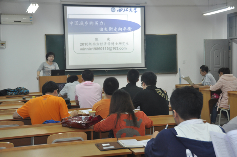 由学院经济学系主办的“现代经济学理论与方法创新论坛”第八卷第一期9月7日下午2点在学院8213教室举行。此次论坛的主讲人为学院2010级西方经济学博士生魏婕,题目为“中国城乡购买力:由失衡走向平衡”,学院经济学系宋宇教授主持,学院的部分博士生,硕士生和基地班的本科生70多人参加了此次论坛。