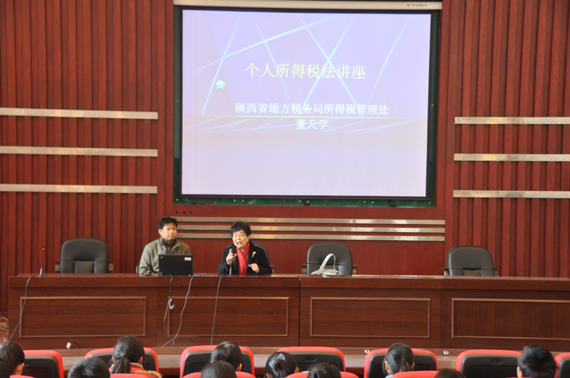 2010年12月15日下午2点,陕西省地税局所得税管理处董天学处长应邀在金海报告厅为我院学生做了题为《个人所得税基本原理》的专题报告。报告会由我院会计专业系主任张晓明教授主持,150余名会计系学生参加。