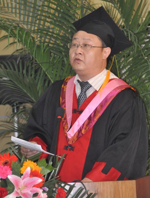 毕业典礼在庄严的国歌中拉开帷幕。首先,阎宏涛副校长致辞。阎宏涛副校长是西北大学MBA教育的创始人之一,主持了西北大学MBA专业学位的申报工作,应邀参加毕业典礼,感触颇深。阎宏涛副校长代表学校党政领导和全校师生员工,向顺利完成学业的各位同学,表示热烈的祝贺;对即将踏上新的征程的各位毕业学员们提出几点希望,一是希望同学们做一个理想远大,境界高远的人,二是希望同学们做一个努力学习,开拓创新的人,三是希望大家做一个脚踏实地、知行合一的人,并祝MBA同学一帆风顺、鹏程万里!