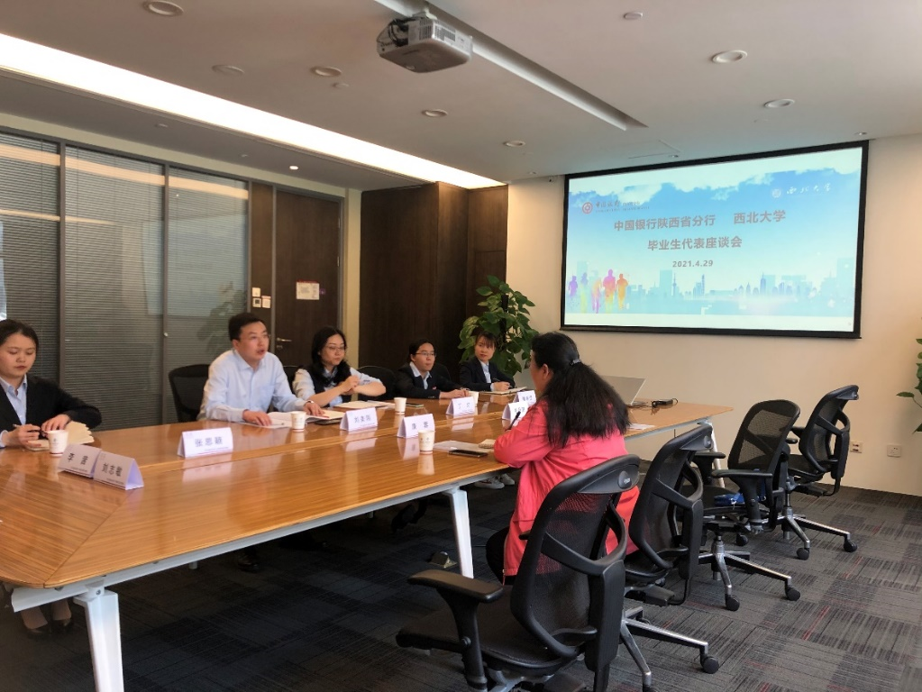 为进一步提升人才培养质量,深入了解学院毕业生的职业发展现状,推进校企合作,助力学院学科发展,4月29日下午,学院康蓉副院长带队赴中国银行股份有限公司陕西省分行参加毕业生代表座谈会,与省分行人力资源部副部长刘美刚、主管丁玎和5名毕业生进行座谈交流。