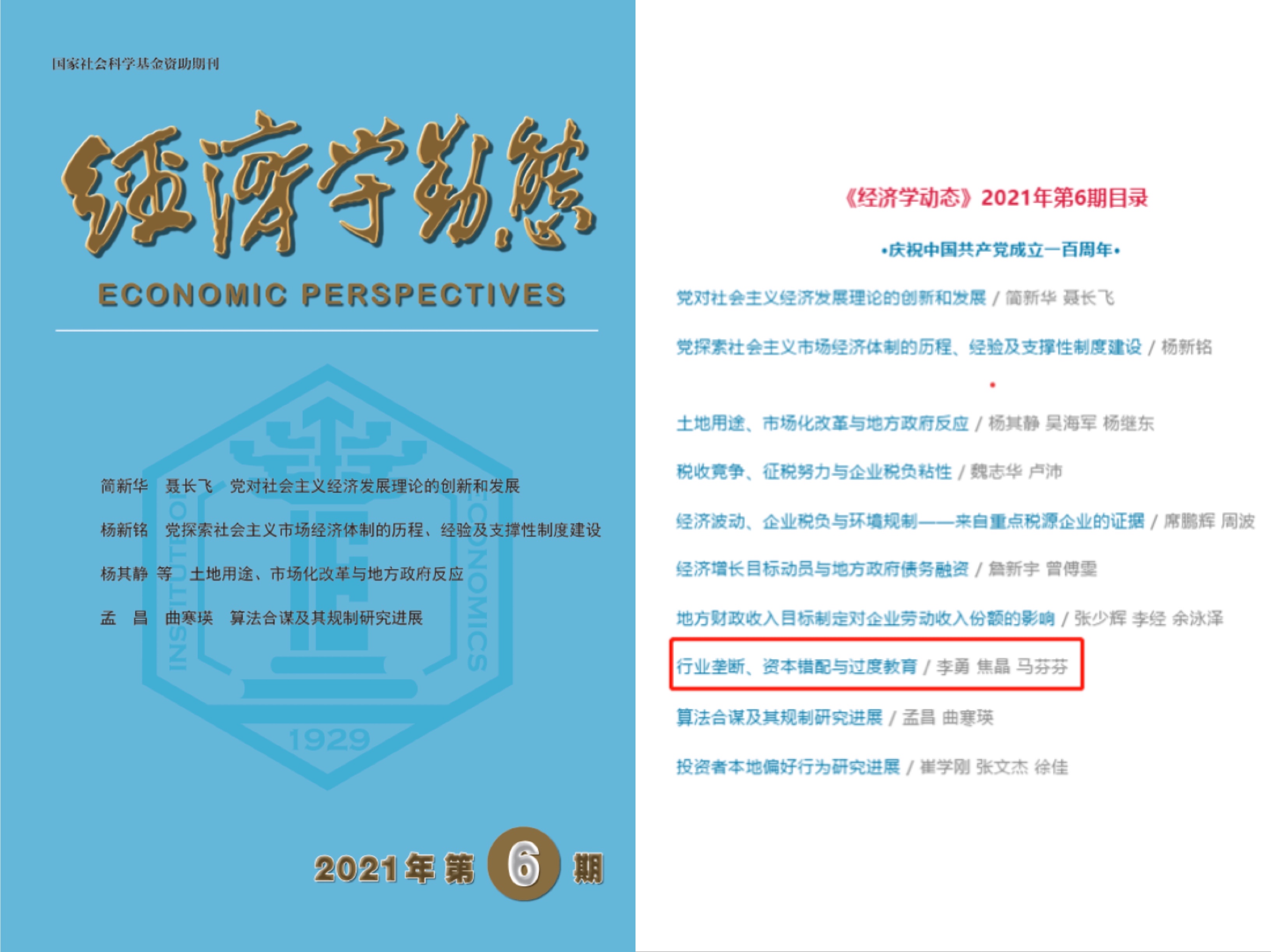 近日,我院教师李勇副教授与合作者焦晶、马芬芬撰写的论文《行政垄断、资本错配与过度教育》,发表在《经济学动态》2021年第6期。该文是作者所承担项目国家自然科学基金青年项目(71704141)和教育部人文社会科学基金青年项目(17YJC790084)的阶段性成果。