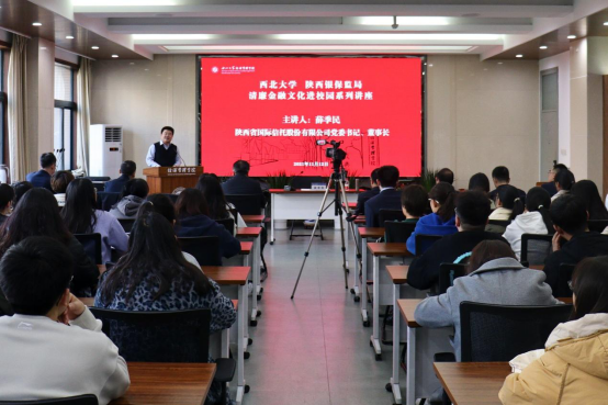 按照我校与陕西银保监局开展清廉金融文化共建活动的安排和与陕国投签署的校企合作协议,11月12日,陕西省国际信托股份有限公司党委书记、董事长薛季民应邀到校,为学院师生作了题为“涵养清廉金融文化,助推陕国投高质量发展”的清廉金融文化系列讲座。陕西银保监局纪委办主任胡海龙,校党委副书记、纪委书记,陕西省监察委员会驻西北大学监察专员李邦邦,党委常委、副校长,776net必赢官网院长吴振磊,学院党委书记杜勇和70余名师生出席了本次活动。讲座由吴振磊主持。