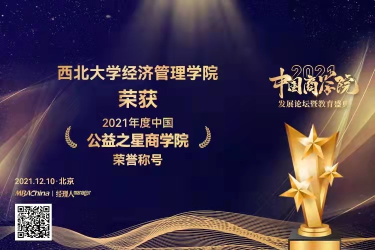 2021年12月10日,“2021中国商学院发展论坛暨教育盛典”圆满落幕。我院MBA项目荣获“2021年度中国商学院最佳MBA项目TOP100”第44名,776net必赢官网荣获“2021年度中国公益之星商学院”荣誉称号。