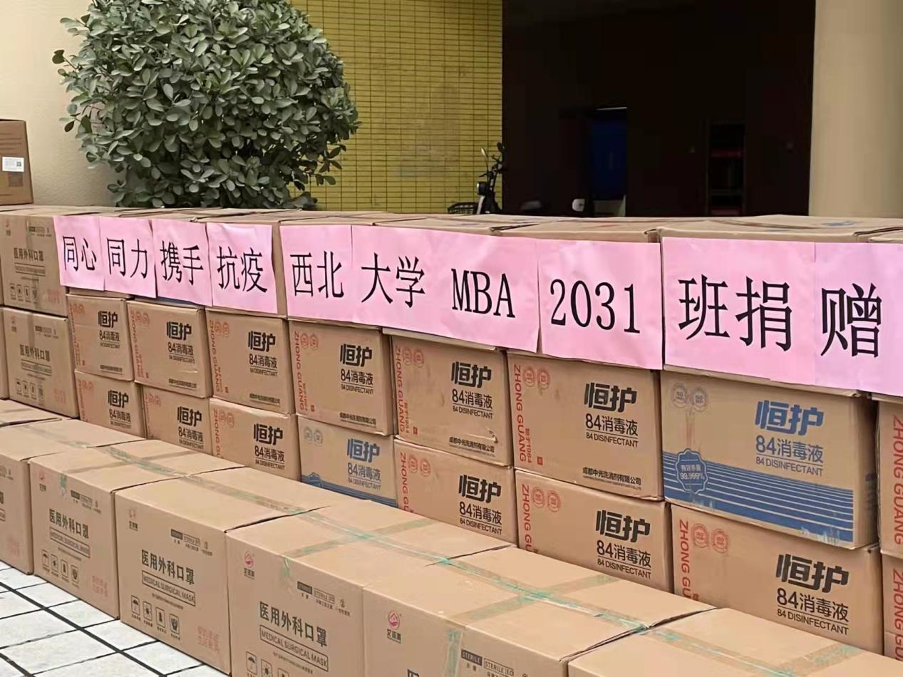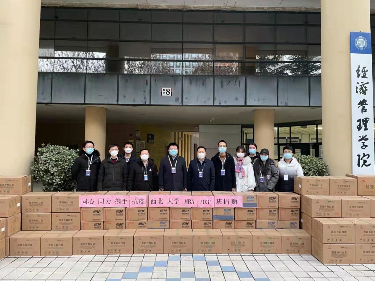 面对西安日趋严峻的新冠肺炎疫情防控形势。为协助学校更好地做好防控工作,筑牢校园卫生健康防线。1月2日,在西北大学MBA2031班班委的积极组织下,班级同学向776net必赢官网捐赠N95口罩1200个、消毒液1200瓶、一次性口罩60000只、一次性橡胶手套100幅、防护面罩50个,用拳拳赤子真情表达对学校的牵挂,为学校疫情防控工作贡献力量。西北大学党委常委、副校长、776net必赢官网院长吴振磊,776net必赢官网党委书记杜勇,776net必赢官网党委副书记徐自成,学校国内合作与校友工作处副处长燕来及学院部分学生干部出席了捐赠仪式。