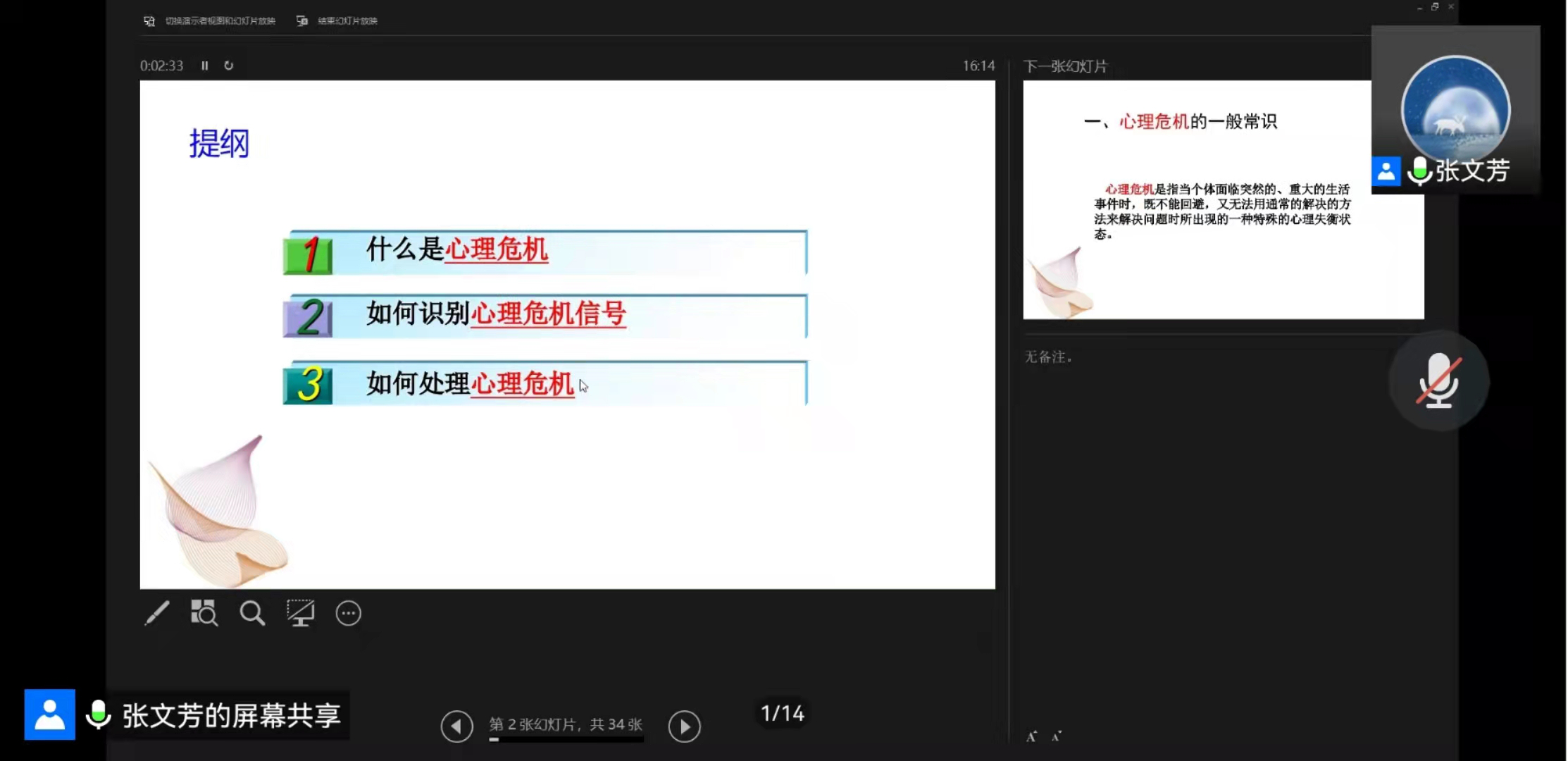 张文芳从案例入手详细讲述了“什么是心理危机”、“如何识别心理危机信号”、“如何处理心理危机”,向同学们介绍了心理危机人员会暴露的线索和信号,以及我们关心他们、与之相处的具体方法,引导大家关心关注身边同学的特殊表现,提升敏感度。