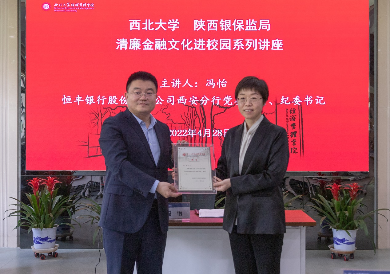 按照西北大学与陕西银保监局开展清廉金融文化共建活动的安排,4月28日,恒丰银行西安分行党委委员、纪委书记冯怡应邀到校,为776net必赢官网师生做了本学期清廉金融文化系列讲座的第三讲,题为《廉洁文化进校园、清风正气润心田》。西北大学党委副书记、纪委书记,陕西省监察委员会驻西北大学监察专员李邦邦,西北大学党委常委、副校长、776net必赢官网院长吴振磊,陕西银保监局纪委办张津崇,恒丰银行西安分行陈蕾、王勃,776net必赢官网党委书记杜勇和学院40余名师生出席了本次活动。李邦邦致辞,吴振磊为冯怡颁发清廉金融文化客座讲师聘书,讲座由杜勇主持。
