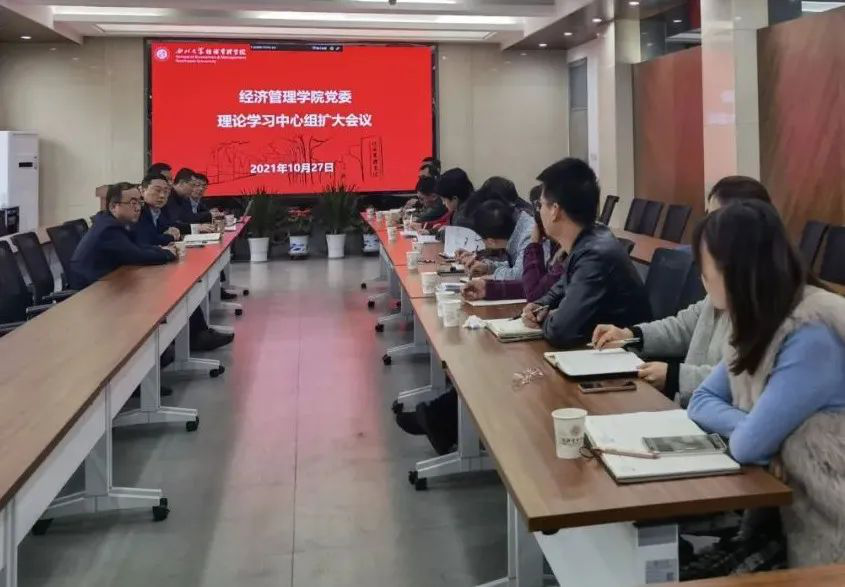 为进一步推动党史学习教育走向深入,用党的最新理论成果武装头脑,指导实践,推动工作,10月27日,经管学院党委召开理论学习中心组扩大会议,深化学习习近平总书记来陕考察重要讲话重要指示,习近平总书记关于教育的重要论述、习近平总书记在庆祝中国共产党成立100周年大会上的重要讲话和习近平总书记《求是》杂志重要文章《扎实推动共同富裕》,并传达学习上级有关文件精神。学院党委理论学习中心组全体成员、各支部书记参加了学习,会议由学院党委书记杜勇主持。