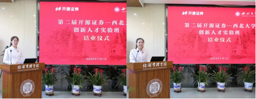 随后,实验班优秀学员代表陈茜、王小雨分享了在实验班半年多时光里的学习、收获和体会。感谢开源证券、西北大学提供了实验班这样创新、前沿、开放、包容的学习平台,加入实验班既学习了专业知识,又历练了实操技能,还积累了调研实践经验。感谢实验班使学员站在更高的平台上,看到更宽广的世界,开阔了视野,有勇气、有信心去拥抱新的变化、迎接新的挑战。