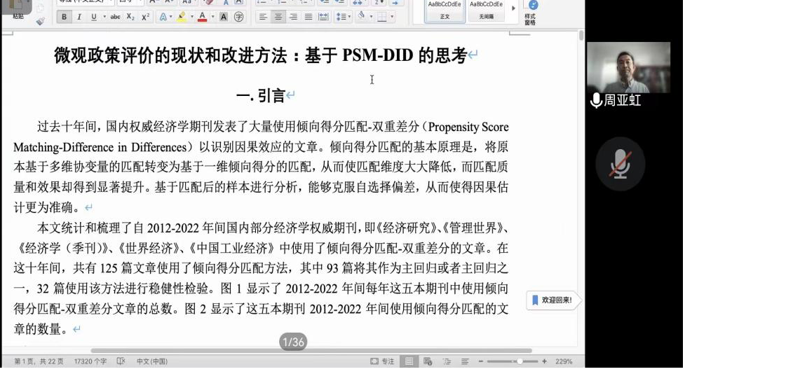 7月13日下午,西北大学120周年校庆年系列活动、“侯外庐学术讲座”第二百三十八讲在腾讯会议平台成功举办。讲座由学院院长马莉莉教授主持,特邀上海财经大学经济学院院长,教育部“国家级人才项目”特聘教授周亚虹做了题为“微观政策评价的现状和改进方法:基于PSM—DID的思考”的学术讲座。学院老师和硕、博士研究生等共计300余人参与了本次线上讲座。
