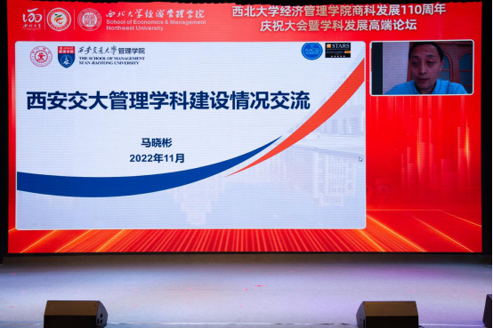 百十芳华,薪火相传。2022年11月19日,“776net必赢官网商科发展110周年庆祝大会暨学科发展高端论坛”在西北大学长安校区隆重举行。来自北京大学、中国人民大学、复旦大学、武汉大学、南开大学、厦门大学、西安交通大学、山东大学、四川大学、重庆大学、湖南大学、西北工业大学、西北农林科技大学、中央财经大学、东北财经大学、西南财经大学、辽宁大学、新疆大学、贵州大学、宁夏大学等全国40所兄弟院校校长、院长,陕西省人民政府学位委员会秘书长袁宁,西北大学校长郭立宏,校党委常委、副校长张远军、吴振磊,西北大学校内各院系和职能部门负责人,海内外广大校友,学院退休教师、教职工和学生代表以“线上+线下”的方式出席活动,共享庆典喜悦、共话一流学科发展。