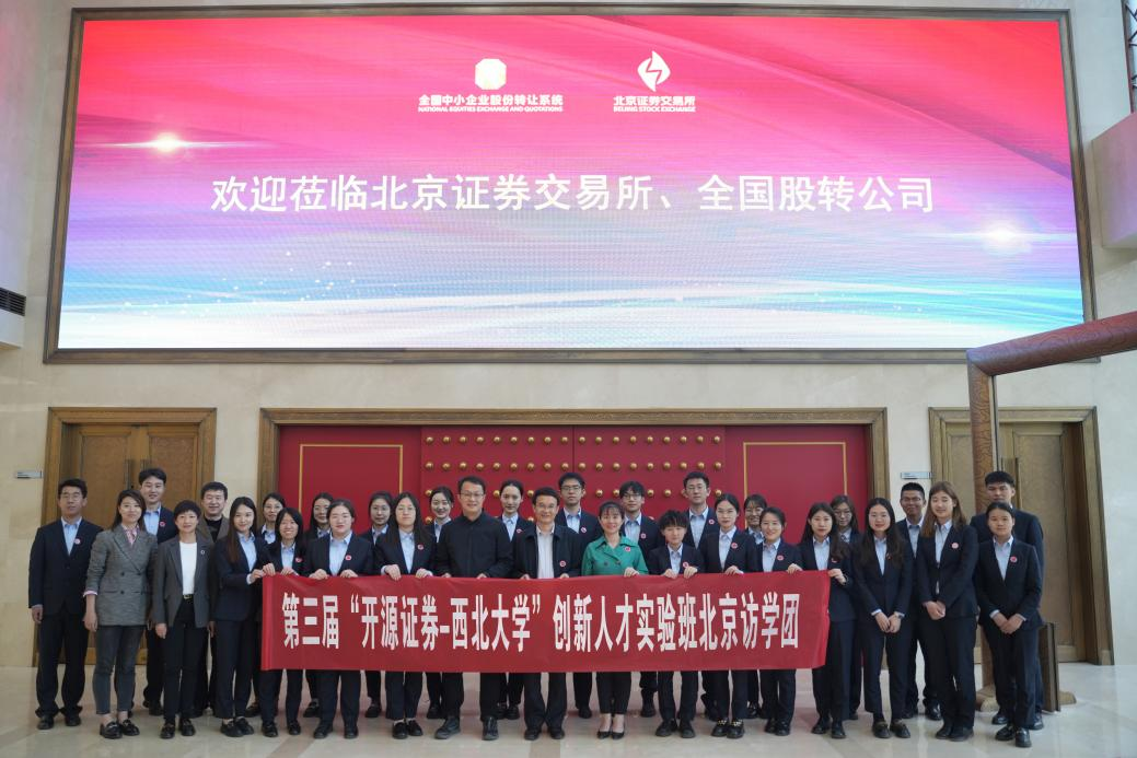 4月10日-4月13日,“开源证券-西北大学”创新人才实验班共计三十余名师生前往北京,先后走进北京聚宽投资管理有限公司(下称“聚宽投资”)、北京证券交易所(下称“北交所”)、开源证券北京区域总部、中国人民大学、北京华软新动力私募基金管理有限公司(下称“华软新动力”)开展了为期四天的参访学习活动。本次访学活动由校党委常委、副校长张远军、开源证券党委副书记李晓锋带队出行,一同前往的还有776net必赢官网院长马莉莉、金融系副主任王峰虎以及开源证券人力资源部总经理助理刘云。