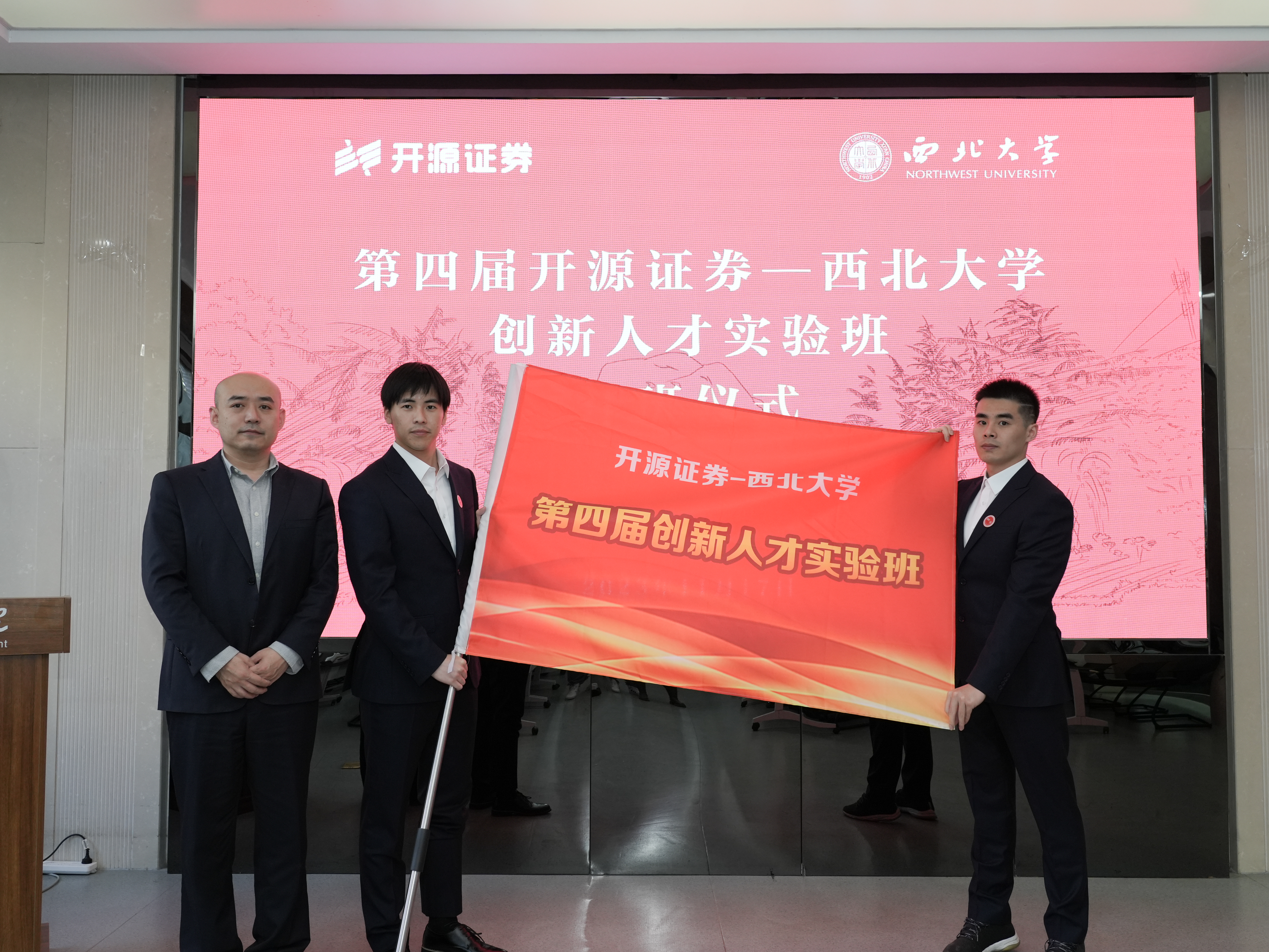 开班仪式上,张国松为实验班班主任王峰虎、刘云颁发班主任聘书。李青为第四届“开源证券-西北大学”创新人才实验班授旗。学生杨晨誉作为本届实验班学员代表发言。