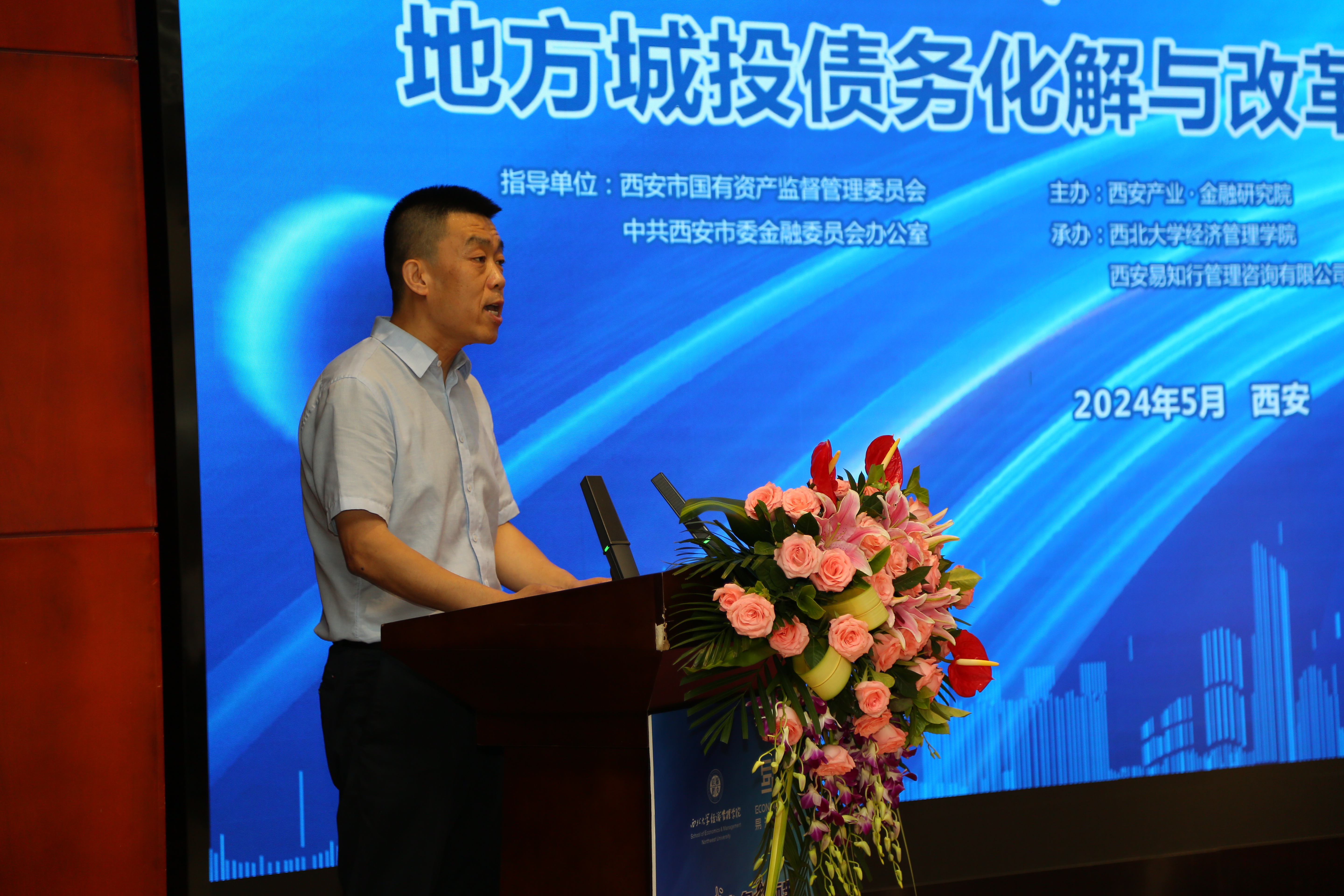 5月15日上午,地方城投债务化解与改革转型发展论坛在我校太白校区举行。全国社保基金理事会原副理事长、西北大学原校长、西安产业·金融研究院学术委员会主任委员王忠民教授,西北大学党委副书记张清,西北大学原校长、西安产业·金融研究院院长郭立宏教授,西安市委金融办副主任杨勇,咸阳市政协副主席、民建咸阳市委会主委房晓飞出席会议。西安市国资委企业改革处、韩城市经开区管委会、咸阳市科学技术协会主席、西安市委金融办风险防控处等部门负责人,西安投资控股有限公司、长安国际信托股份有限公司、西安金融控股有限公司、西安启创财智管理咨询有限公司、西安朱雀嬴投资管理有限公司、西安企业资本服务中心有限公司、易知行咨询集团、西安市西环环境工程有限公司、西咸水务集团、西安未央城市建设集团有限公司、西安经开金融控股有限公司等企业董事长、总经理,以及来自陕西科技大学、西安财经大学、咸阳师范学院、榆林学院、榆林师范学院、西安欧亚学院和西北大学等高校的专家学者、师生代表、媒体代表等百余人参加活动。论坛开幕式由我院党委书记张宇主持。