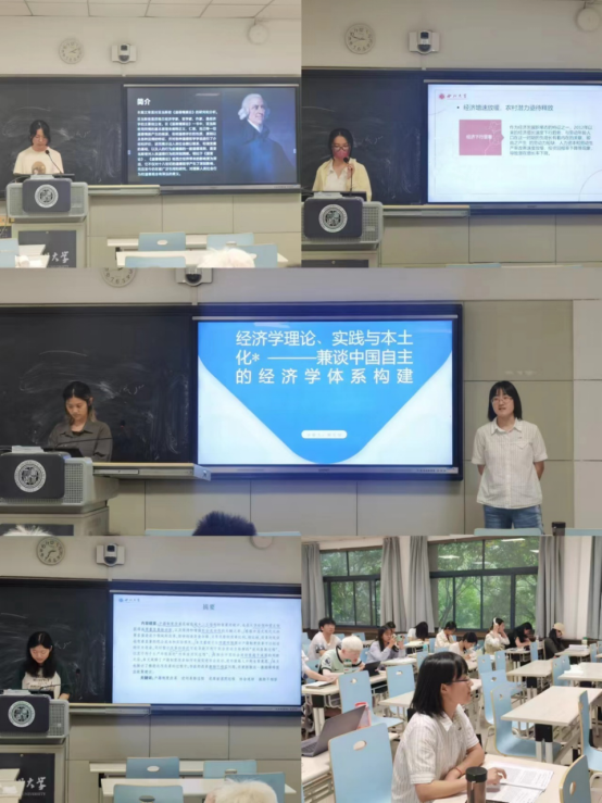 本次“基地学术课堂”的文献研习共有两篇文献。第一篇文献是《经济学理论、实践与本土化——兼谈中国自主的经济学体系构建》,来自《经济研究》2023年第12期。2021级经济学基地班本科生解蕾凝从文献评述、西方经济思想史视角的反思和中国经济学本土化的必要性这三个方面讲解了这篇文章。2022级经济学基地班本科生薛鸣怡从逻辑顺序与创新点这两个方面点评了这篇文章。