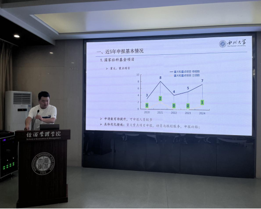 紧接着,学院科研助理、经济学系赵仁杰副教授汇报了近五年来我院国家社科基金、国家自科基金、教育部人文社科基金的申报情况,分析了学院基金申报的变化特征和需要注意的问题。结合2024年申报经验,汇报了2025年国家基金申报的详细工作计划。