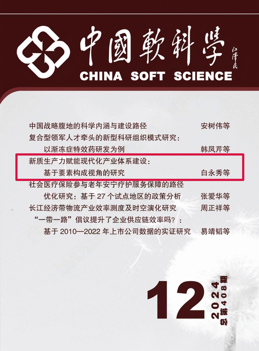 近日,我院白永秀教授、博士生闫雪培和青年教师王泽润博士的合作论文《新质生产力赋能现代化产业体系建设——基于要素构成视角的研究》在权威期刊《中国软科学》2024年第12期以封面文章形式刊发。