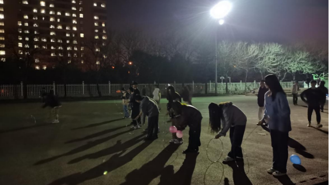 活动开始的第一个环节是“踩气球”。心协成员将事先准备好的蓝白粉三色气球散发给同学并按照颜色分为三组,同学们需要相互踩压对方脚上的气球,最后剩余气球最多组获胜并上台领取奖励。活动过程中,同学们你追我赶,欢呼雀跃,现场氛围十分活跃,也达到了热身的效果。