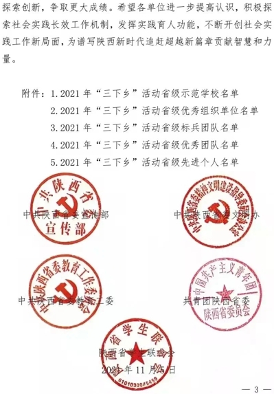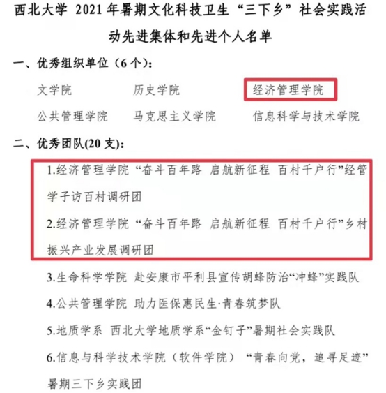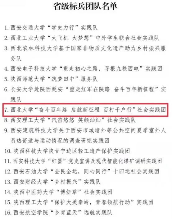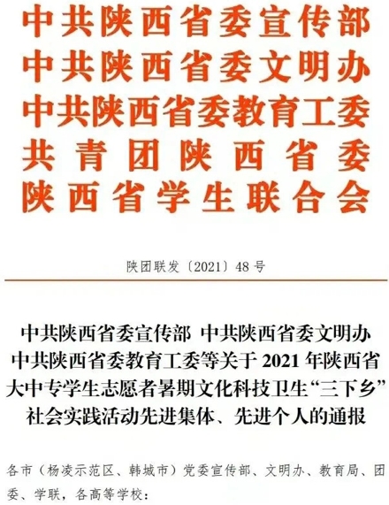 近日,中共陕西省委宣传部、中共陕西省委文明办、中共陕西省委教育工委、共青团陕西省委、陕西省学生联合会印发《关于2021年陕西省大中专学生志愿者暑期文化科技卫生“三下乡”社会实践活动先进集体、先进个人的通报》的文件中,由我院师生组成的西北大学“奋斗百年路 启航新征程 百村千户行”社会实践团荣获2021年陕西省大中专学生志愿者暑期文化科技卫生“三下乡”社会实践活动“省级标兵团队”荣誉称号。