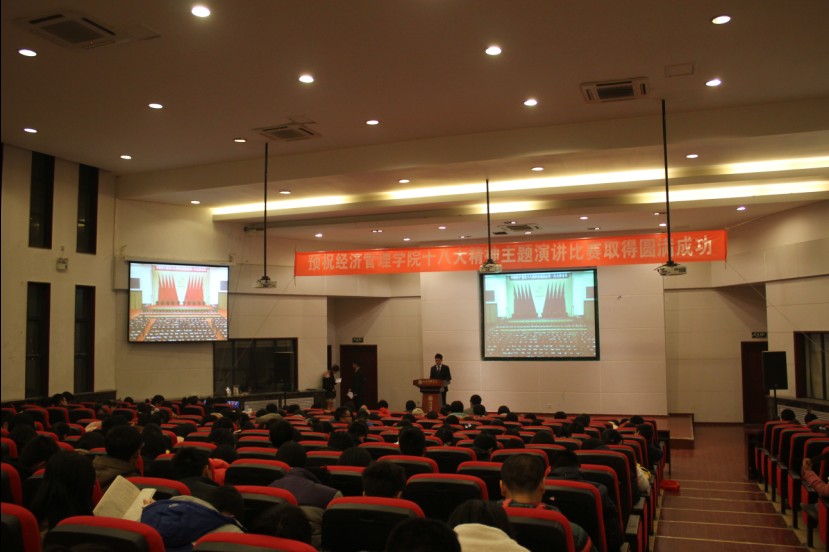 比赛中,演讲同学以回顾党的历史,弘扬十八大精神为共同主题,从不同的视角向大家展示了经管学子眼中的十八大。工商班孙飞扬同学在演讲中以煽情的话语带领观众回顾中国共产党走过的峥嵘岁月,最后以温总理的话“让人民生活的更加幸福,更有尊严”结束,得到了同学们热烈的掌声,并最终成为本次演讲比赛的冠军。财政班的《学习十八大精神,创祖国美好未来》,信管班的《不朽的信仰》等演讲也给观众留下了深刻印象。