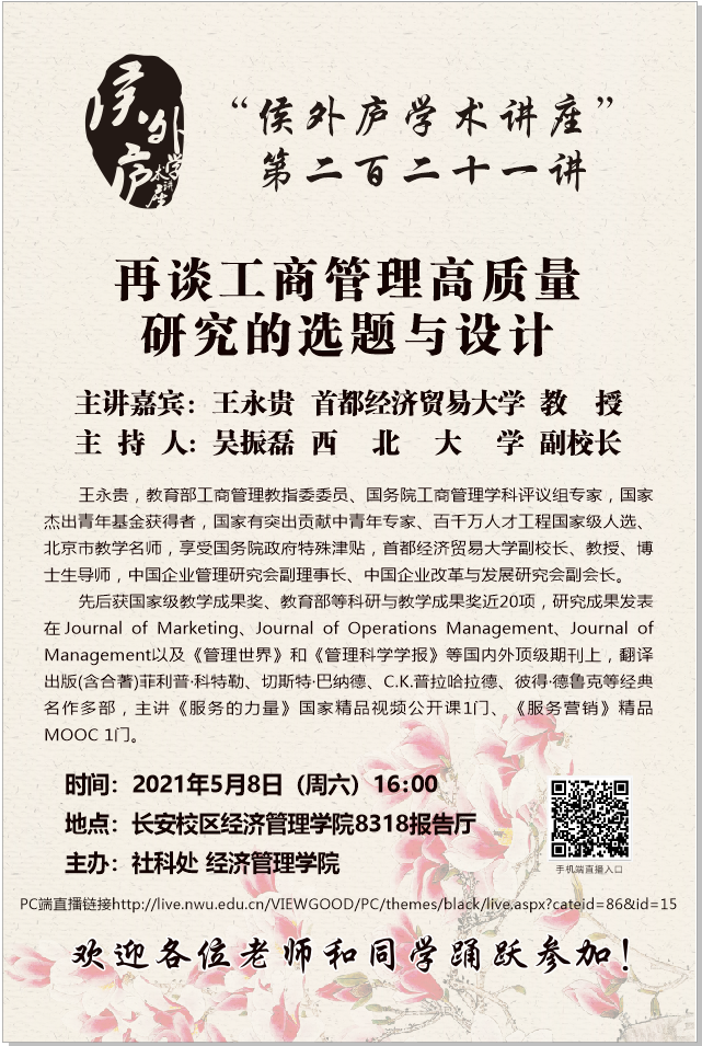 “侯外庐学术讲座”第二百二十一讲:再谈工商管理高质量研究的选题与设计