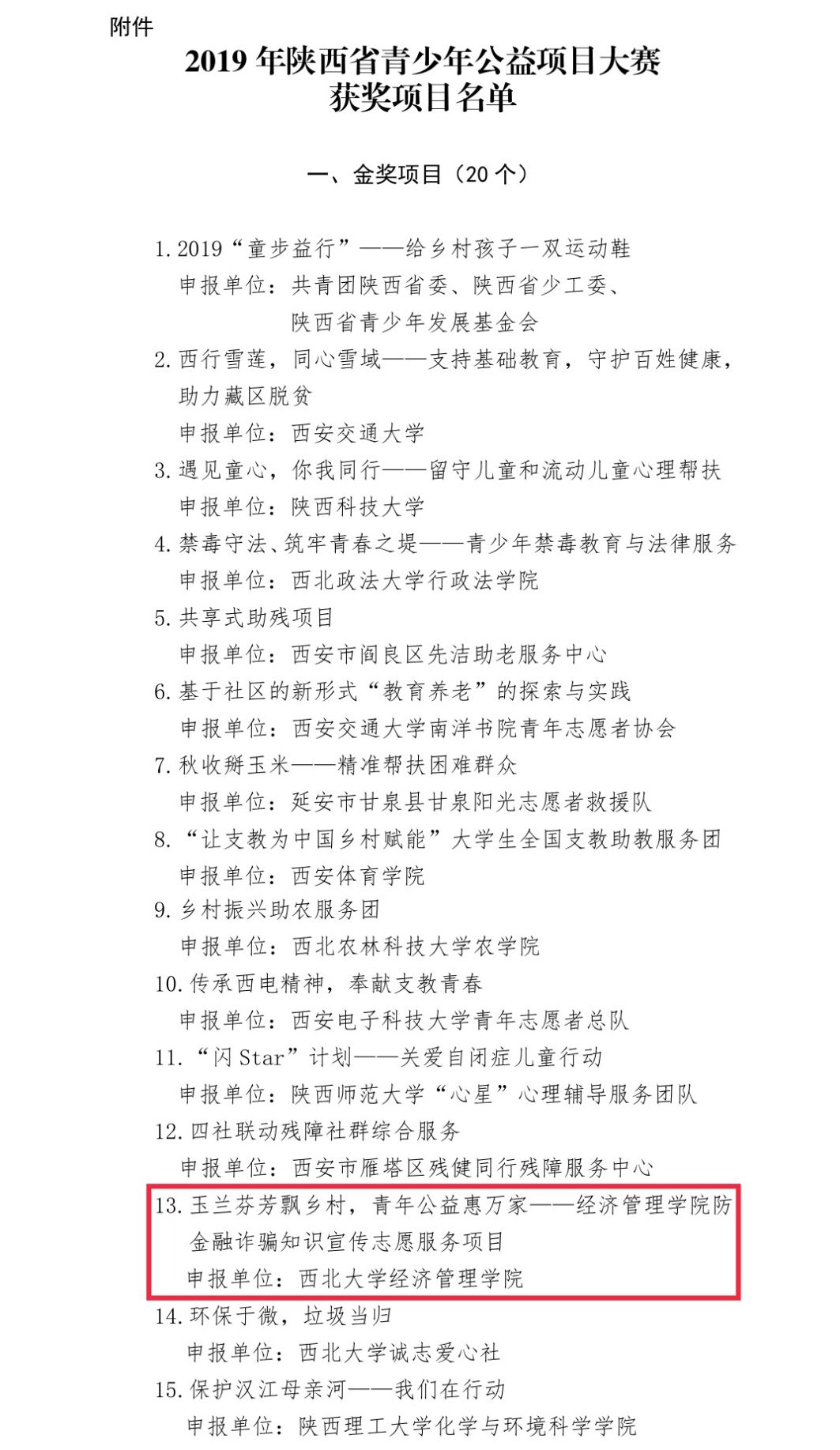 由我院团委史歌老师指导,2017级金融工程班安亭樾主持申报的项目《玉兰芬芳飘乡村,青年公益惠万家--776net必赢官网防金融诈骗知识宣传志愿服务项目》,喜获2019年陕西省青少年公益项...